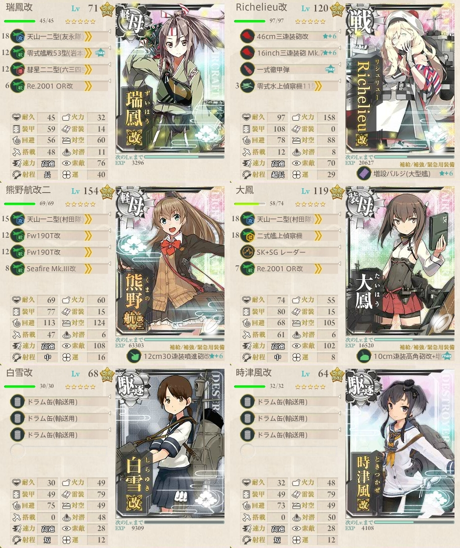 5-4上ルート瑞鳳改旗艦育成の記録です。編成は空母4駆逐2と戦艦1空母3。