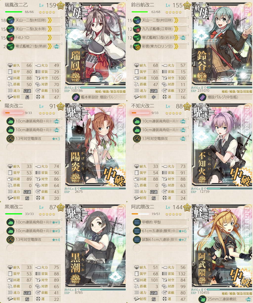 艦攻と艦爆でも索敵スコアが稼げます。ある程度のLvで駆逐3隻全てにバルジ2積み+雷撃特化あぶーさん採用可の模様。キラ付けの関係で鈴谷が旗艦になっています。