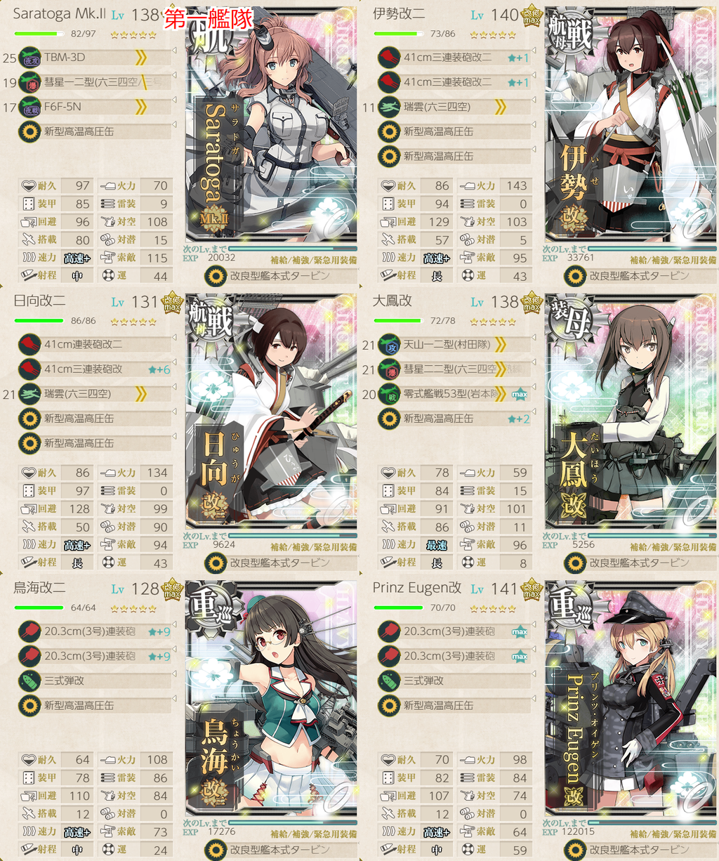 今回はボーキ消費が少なめの編成でした。高速+でスロットを圧迫されつつも初手潜水マスの敗北回避、ボス攻略と装備パズルのような感じでした。