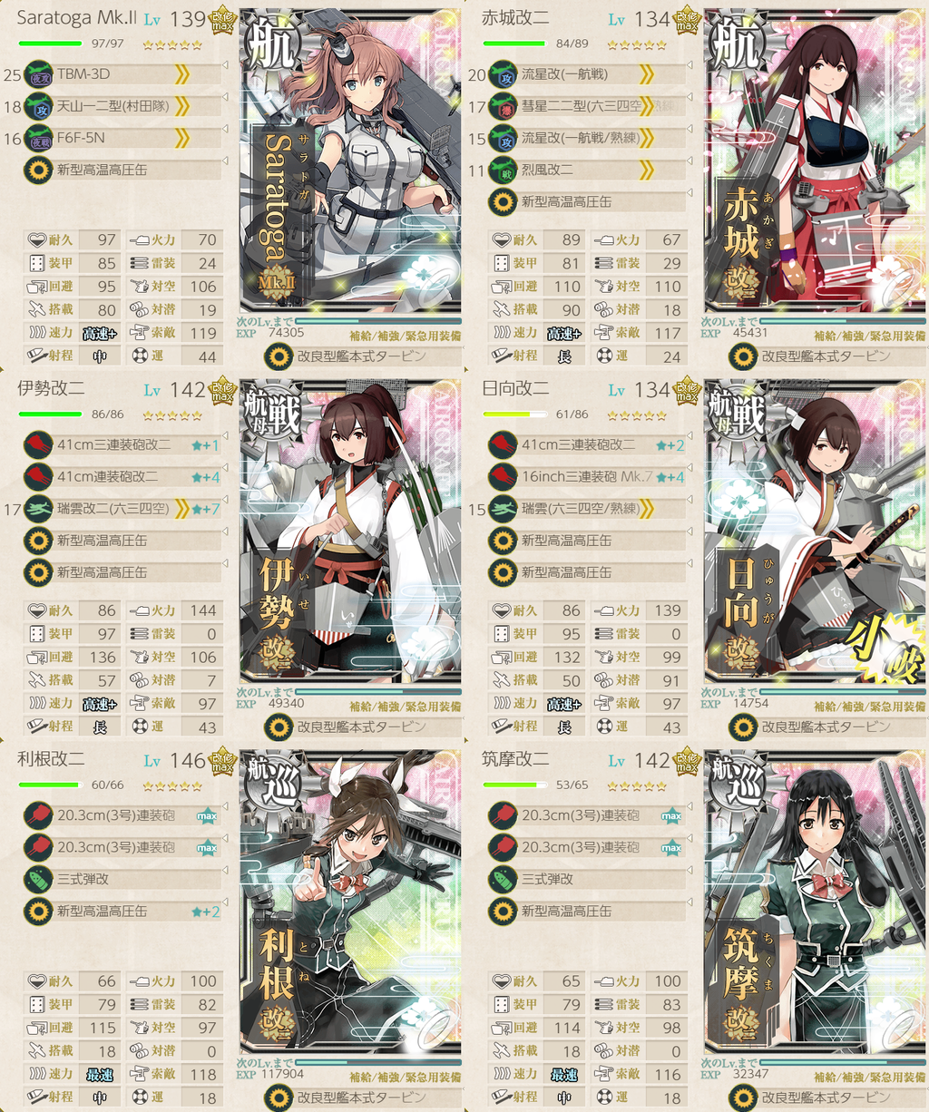 重巡系については艦隊の弾着率と戦爆CI率を上げる場合は索敵の高い航巡で良いですが今回は重巡を使用しました。砲戦火力もそこそこある編成ということで今月はゲージ破壊までボス前はアップデートされた梯形陣で撤退なしでした。勝手に砲戦火力0.8がけの昼戦回避補正upと見込んでいます。
