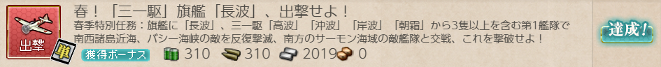 春季特別任務:旗艦に「長波」、三一駆「高波」「沖波」「岸波」「朝霜」から3隻以上を含む第1艦隊で南西諸島近海、バシー海峡の敵を反復撃滅、南方のサーモン海域の敵艦隊と交戦、これを撃破せよ!