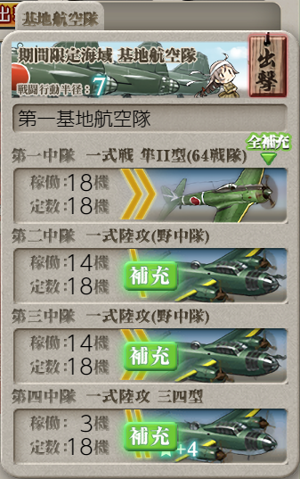ボスマスは弱編成なら基地+本隊でS勝利までいけそうですが、空襲マスで撤退がやや出たので基地は主に空襲マスに送っていました。