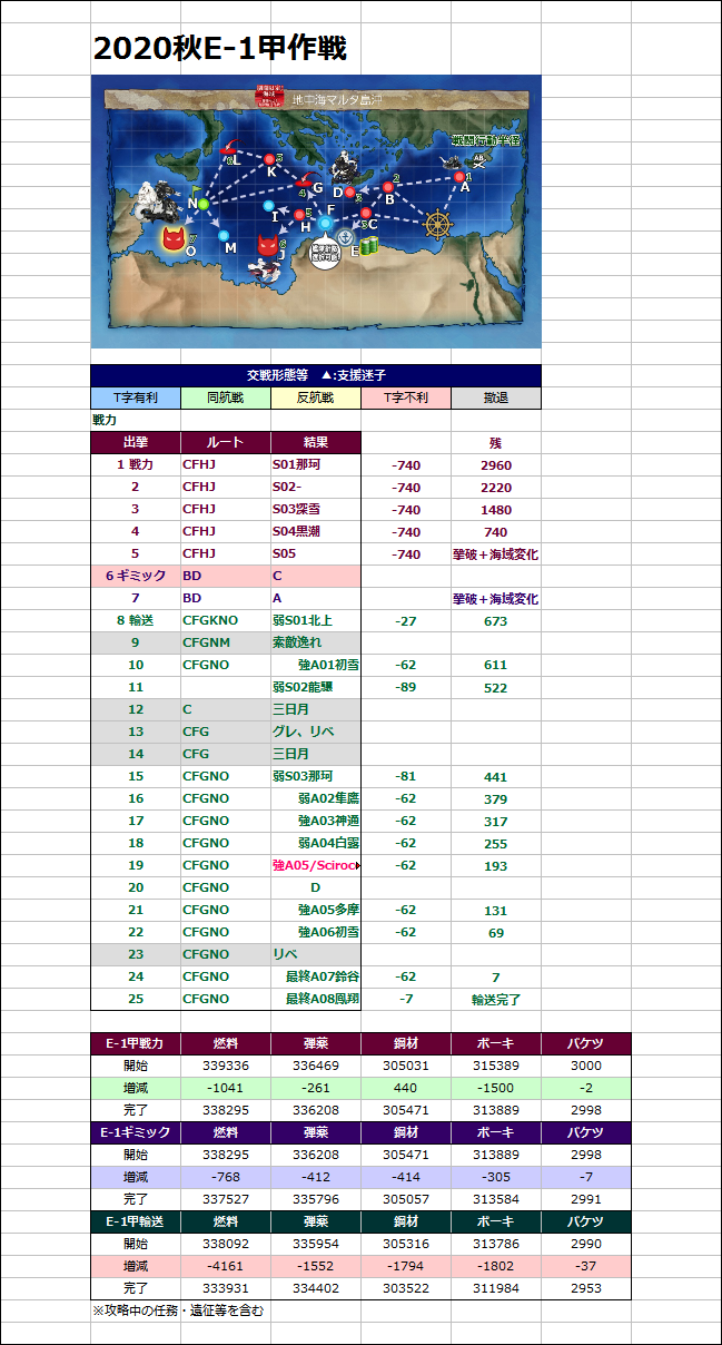 2020秋冬E-1「発動!MG1作戦」戦力/ギミック/輸送 甲作戦 の記事です。