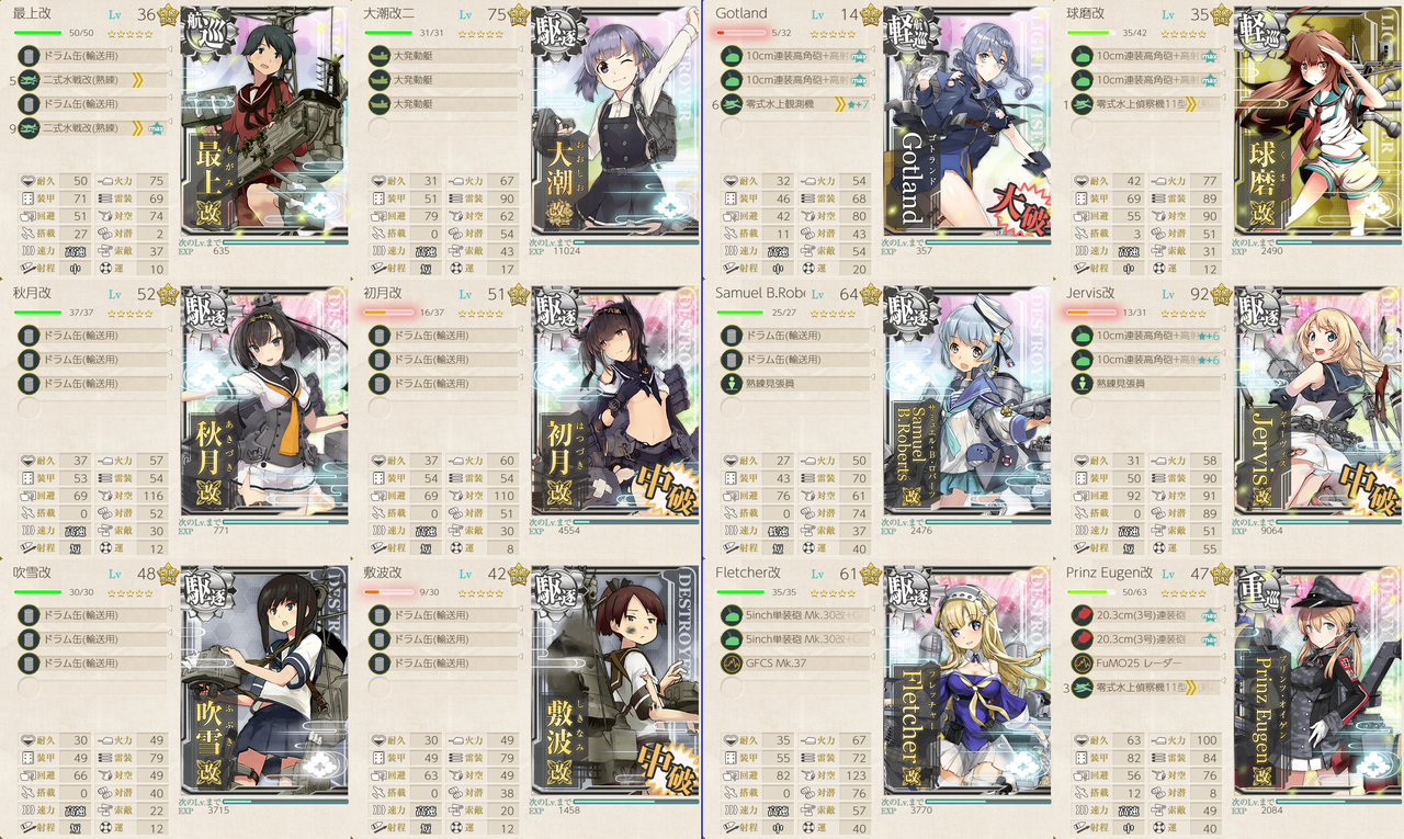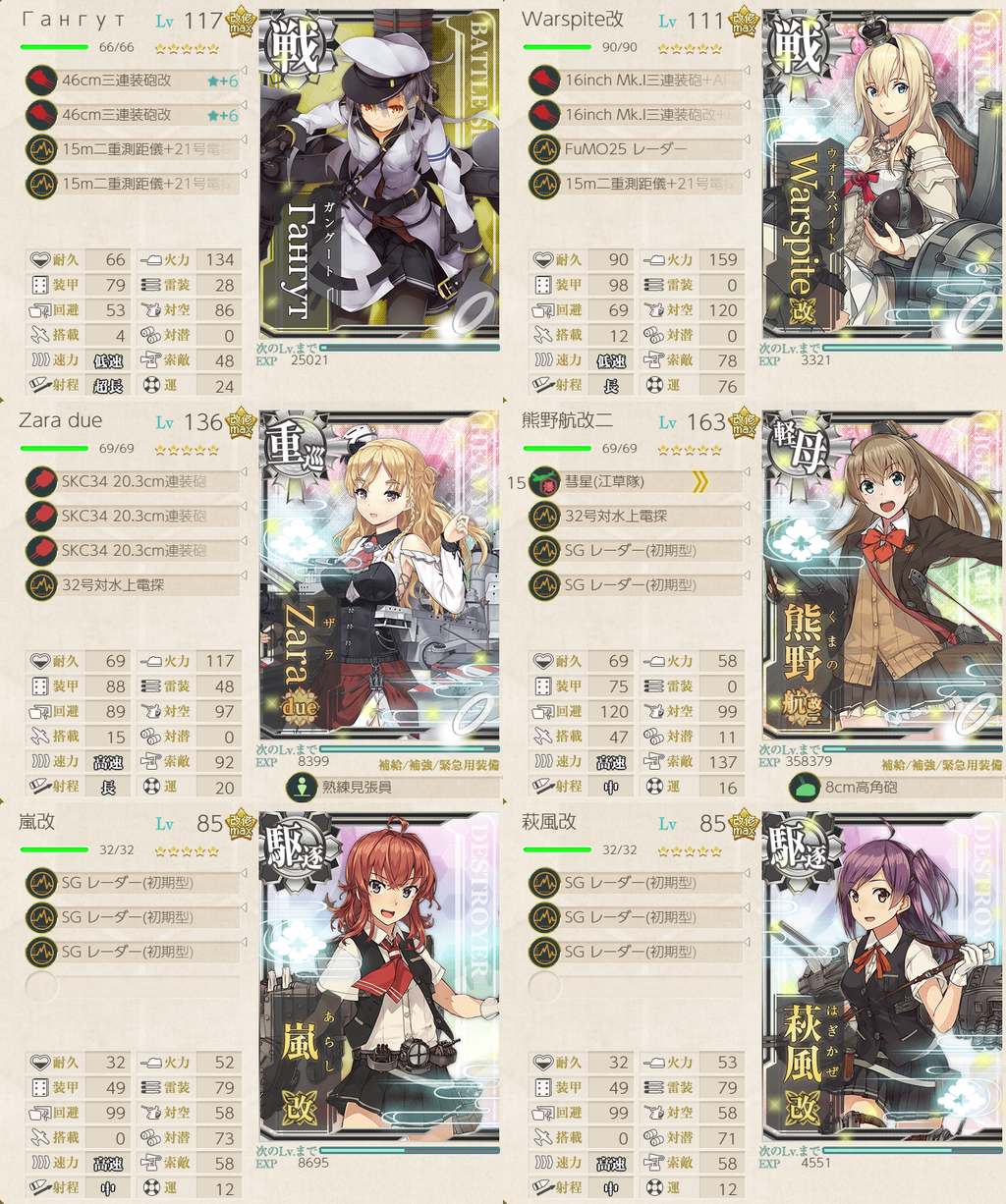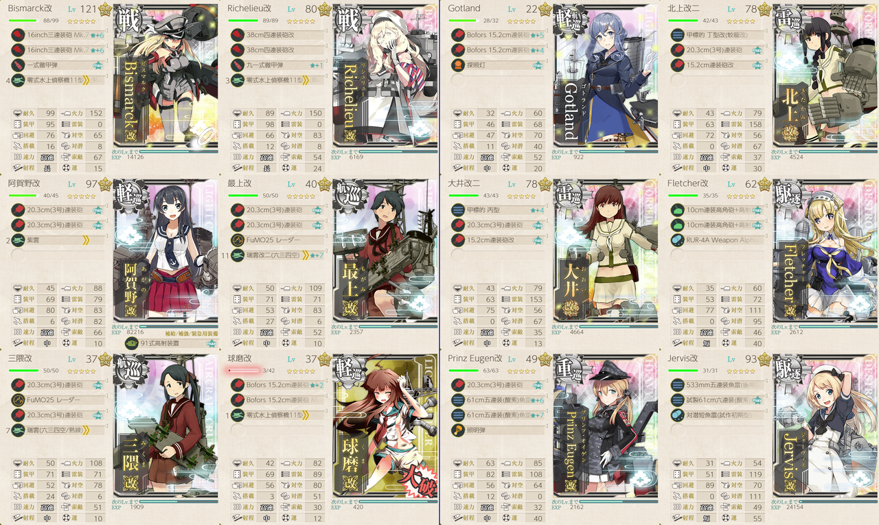 この編成でNマスS勝利時にTP-152となります。プリンツ、ジャーヴィスは特に掘りを見越しての採用でしたが、戦力ゲージで北上と大井のサブ使えるなら無理に採用する必要性はありません。戦力ゲージ攻略では北上様と大井っちで十分な印象でした。Gotland、球磨、Samu、Jarvis、Fletcher、Prinz