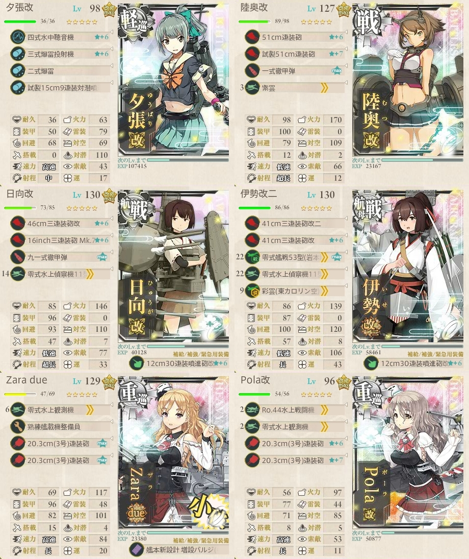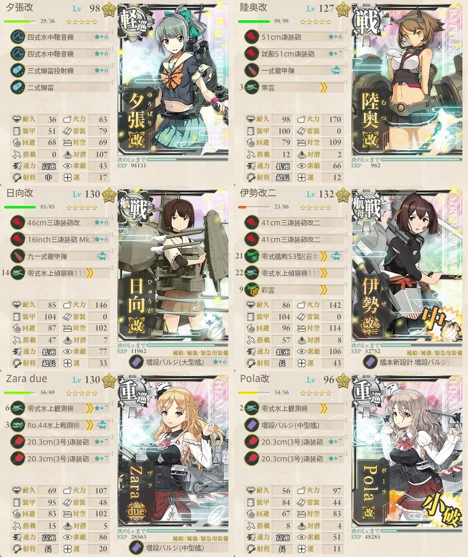 伊勢改二の装備については彗星系の集中運用も考えられ、重巡系2のほうも突破率をより上げるために弾着装備&バルジの使用も考えられます。今回はザラ姉さまに火力を寄せた編成例でした。本当は航戦の増設もバルジのほうがいいかも?そのほか射程調整や採用艦はお好みで。
