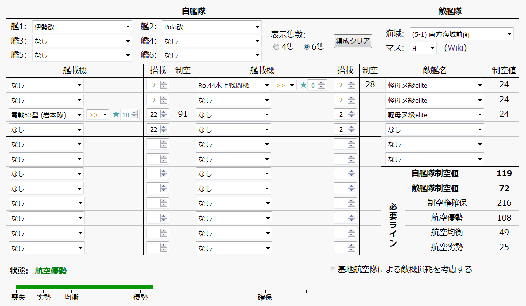 5-1攻略上、敵編成で一番制空値が高いマスはHマスですが、装備スロット2個分で優勢を取りやすくなりました。